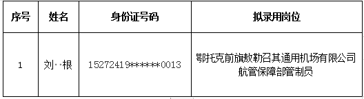 按照《鄂托克前旗敖勒召其通用機(jī)場有限公司公開招聘管制員公告》要求,經(jīng)信息發(fā)布、組織報(bào)名、資格審查、面試等程序,現(xiàn)將擬錄用人員進(jìn)行公示: